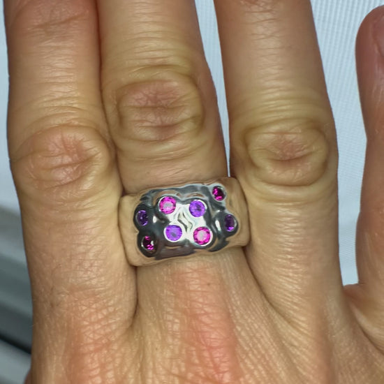 A classic cigar band style with modern texture featuring a cluster of natural pink and purple dreamy stones